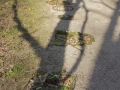 Je n’ai pas l’habitude de ce genre de site, qui ne se prête pas facilement au Land Art, mais c’est justement le challenge qui me pousse à dire oui ! Et puis l’apparent antagonisme entre le milieu industriel et le milieu naturel m’inspire… la visite des lieux me le confirme. D’une part la signalétique au sol, avec ses rayures obliques et ses pictogrammes peints en jaune, alerte le piéton sur les multiples dangers qui le guettent ici, sur les espaces qui lui sont réservés pour circuler… Le sol dit partout « Attention, danger ! ».