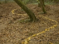 Sentir les feuilles, écouter les oiseaux, découvrir par des jeux des couleurs d’automne, imaginer la vie animale à la nuit tombée… Après ces activités de découverte du site, les enfants ont réalisé des chemins, pour figurer le passage des différents animaux sauvages qui traversent la clairière en notre absence : il fallait dégager le sol terreux des feuilles mortes, en réalisant des courbes. Puis les enfants ont mis en valeur deux chemins en créant un chemin de feuilles jaunes, et un autre avec des branches mortes.