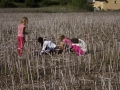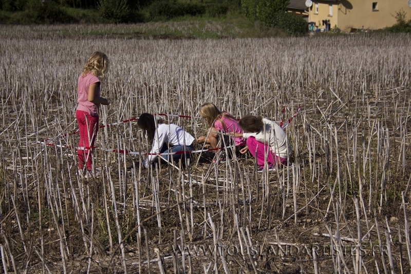 Un atelier sur le thème de l’observation : dans la forêt il fallait jouer au détective sur une « zone de crime » délimitée par du ruban de chantier, et découvrir les « erreurs » réalisées façon Land Art par Lydie en secret. Puis 4 équipes de « détectives/Land Artistes » ont eu une parcelle dans le champ en face de l’école à photographier en détail avec ses yeux et sa mémoire. Les équipes laissaient leur parcelle pour modifier façon Land Art celle d’une autre équipe, subtilement. Puis chaque équipe devait retrouver dans sa parcelle les modifications faites par une autre.